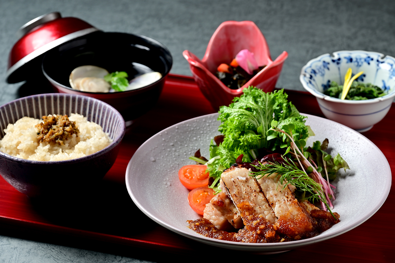 茶美豚の生姜焼き膳 脂が甘い茶美豚の肩ロースを塩麹で柔らかくしました。生姜の香りが食欲をそそります。