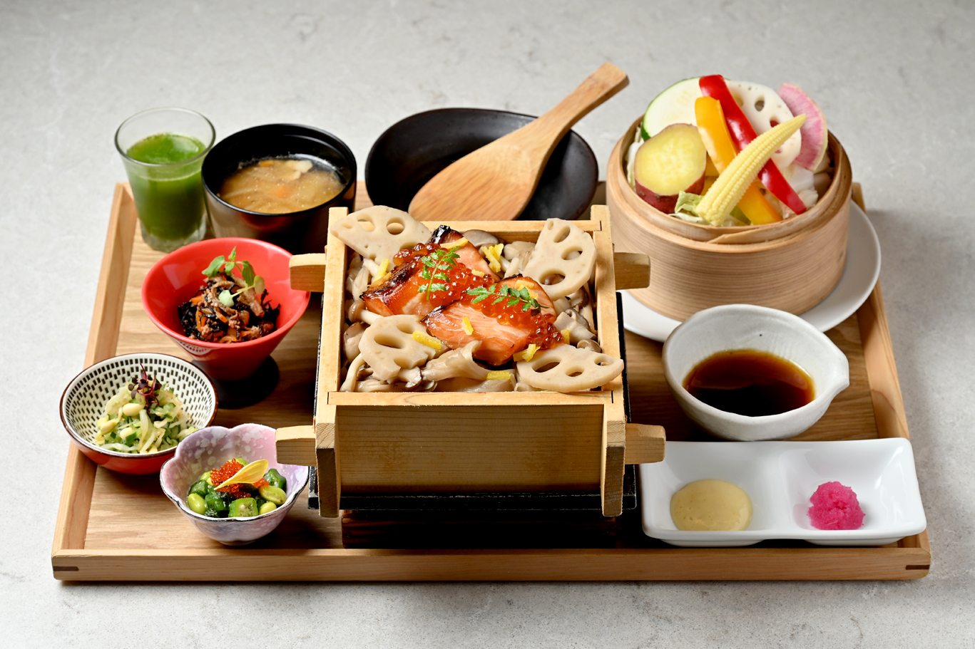 旬のキノコとお出汁で炊き上げたご飯の上に柔らかく仕上げたサーモンを乗せてせいろで蒸し、いくらを添えました。