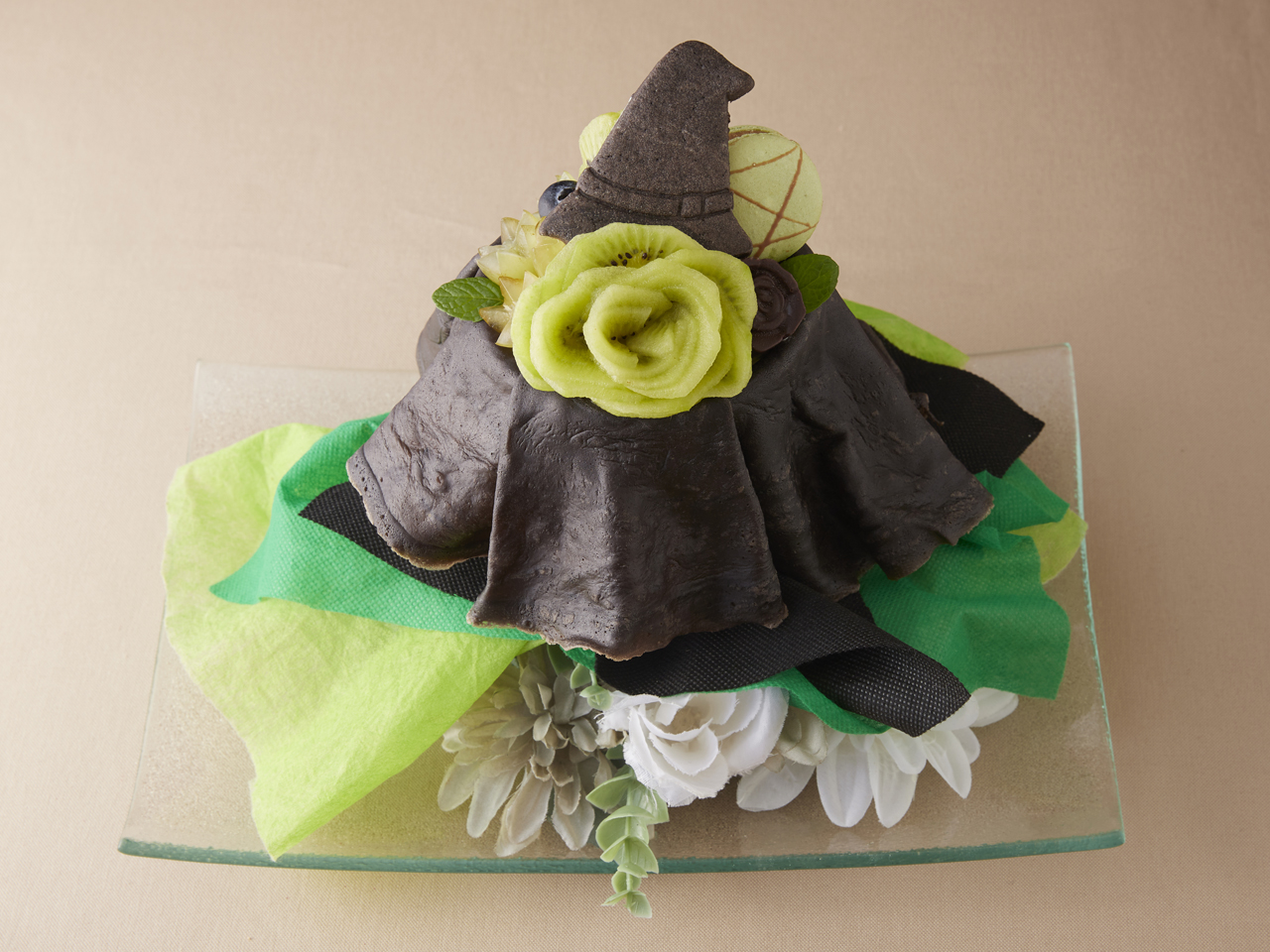 グリーンブラックドレスブーケクレープ エルファバの力強さと気高さを、瑞々しいキウイと黒を基調としたシックなデコレーションで表現。