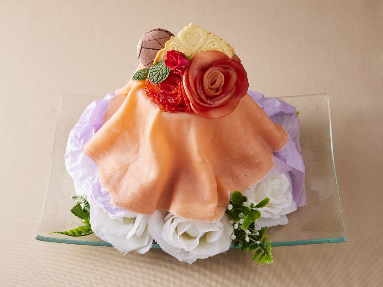 ピンクドレスブーケクレープ グリンダの華やかで愛らしいドレスを、フレッシュな苺と優美な盛り付けで表現。