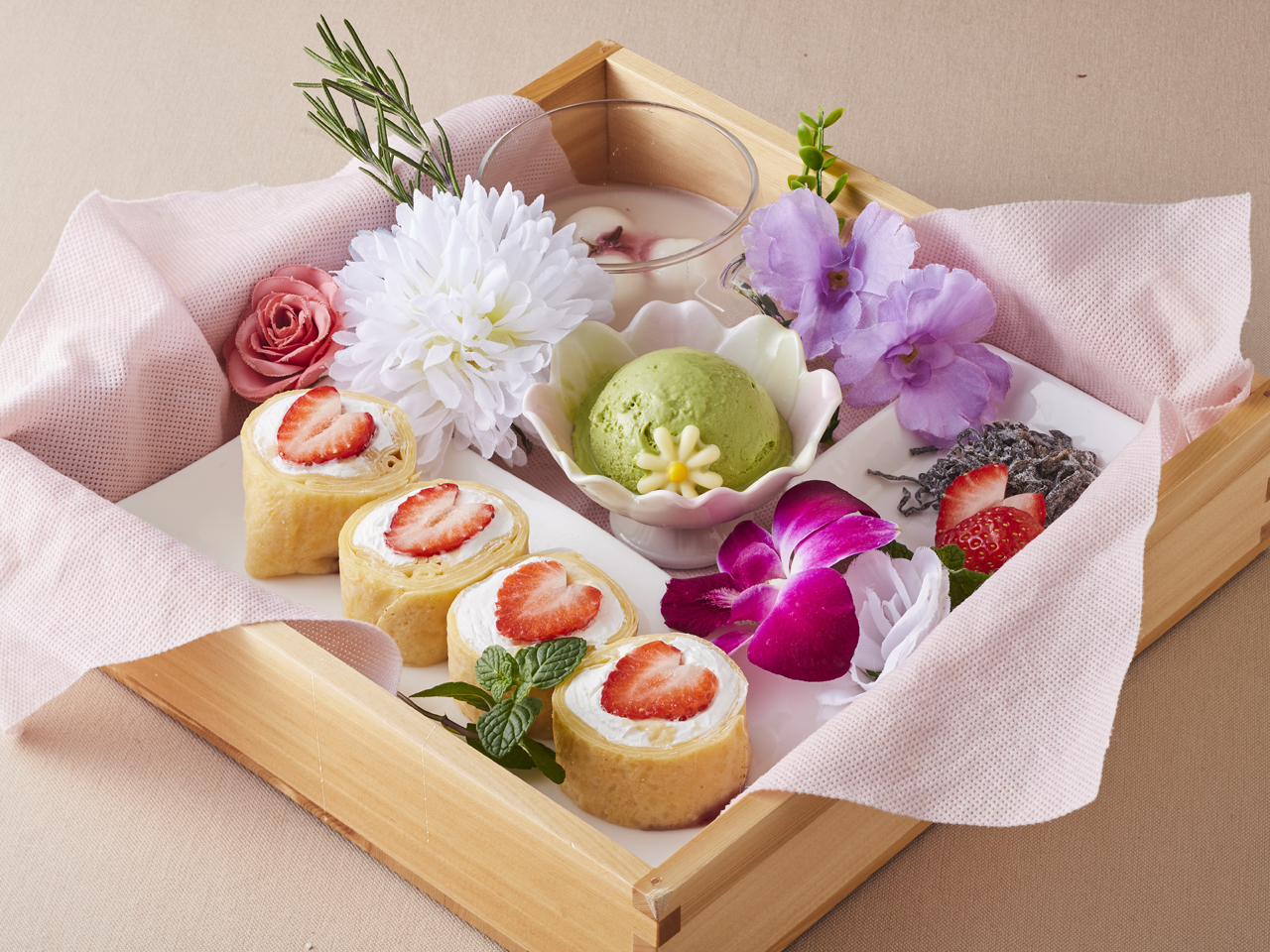 甘酸っぱい「いちごロールクレープ」に、濃厚な「抹茶アイス」と、優しい甘さの「白いお汁粉」。最後にお口をきゅっと引き締める「塩昆布」を添えて。彩り豊かな和と洋のスイーツが織りなす、この季節だけの特別なデザートボックスです。新しい季節の始まりを、ぜひロカンダでお過ごしください。