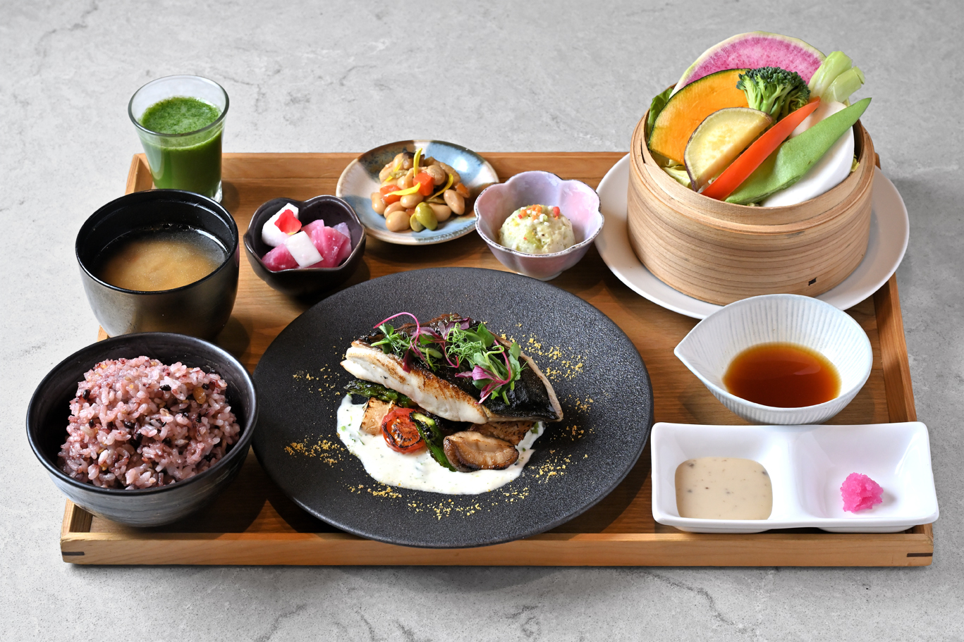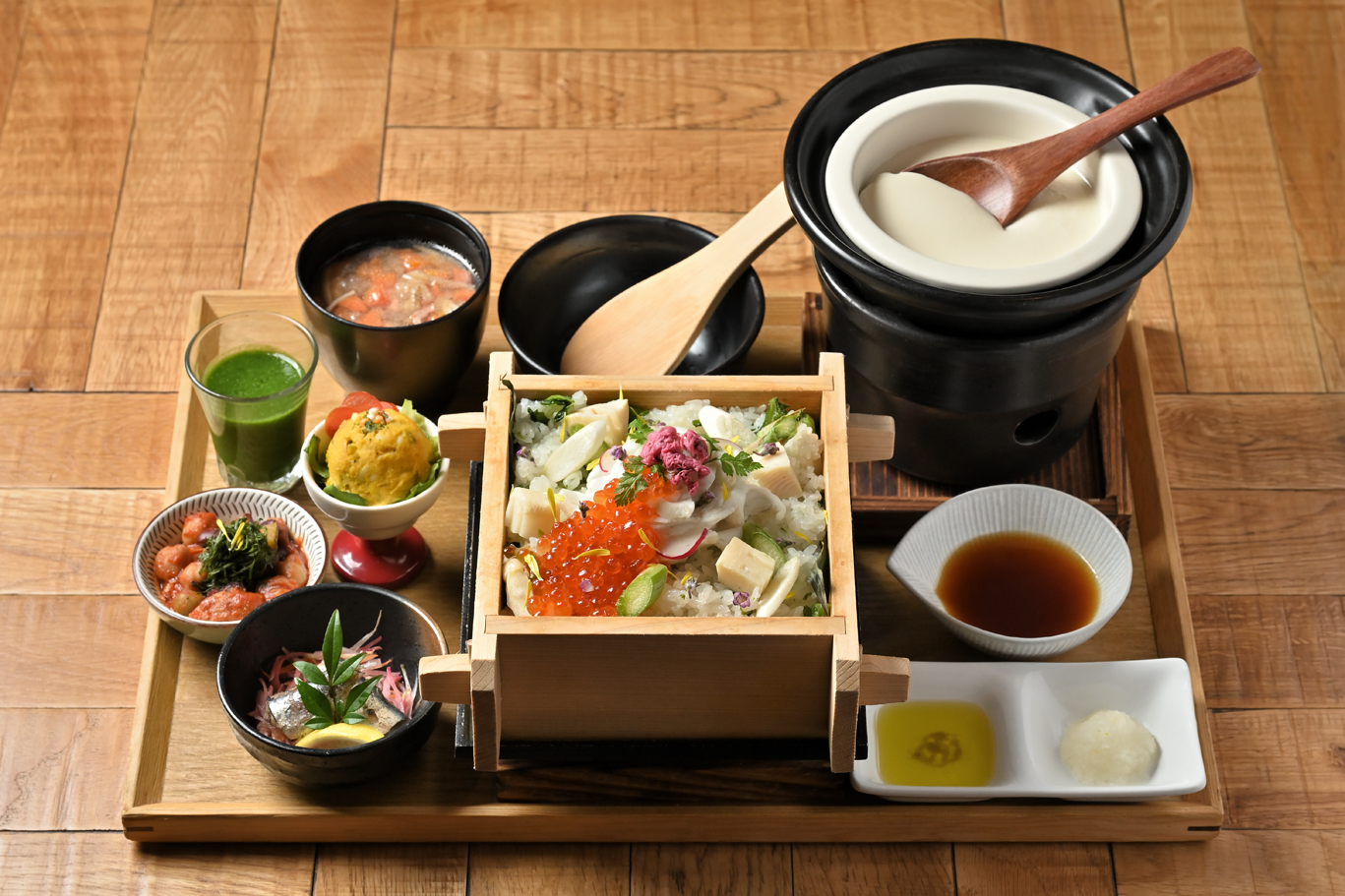 それぞれお食事の始まりには、身体を整えるグリーンジュース。さらに季節の素材を使った副菜3種、具だくさんの豚汁と、食べるほどに身体が喜ぶラインナップ。炊きたての土鍋おぼろ豆ふか野菜せいろ蒸しもお選びいただけます。